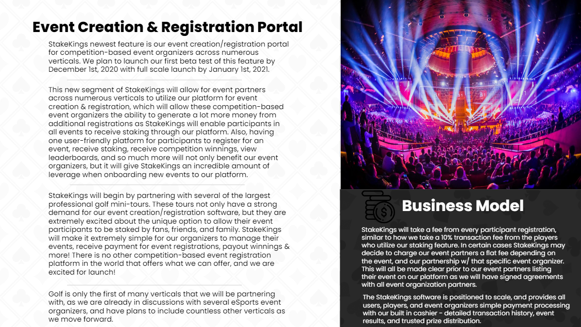 This new segment of StakeKings will allow for event partners across numerous verticals to utilize our platform for event creation & registration, which will allow these competition-based event organizers the ability to generate more revenue from additional registrations as StakeKings will enable participants in all events to receive crowd-staking through our platform. Also, having one user-friendly platform for participants to register for an event, receive staking, receive competition winnings, view leaderboards, and so much more will not only benefit our event organizers, but it will give StakeKings additional leverage when onboarding new events to our platform.